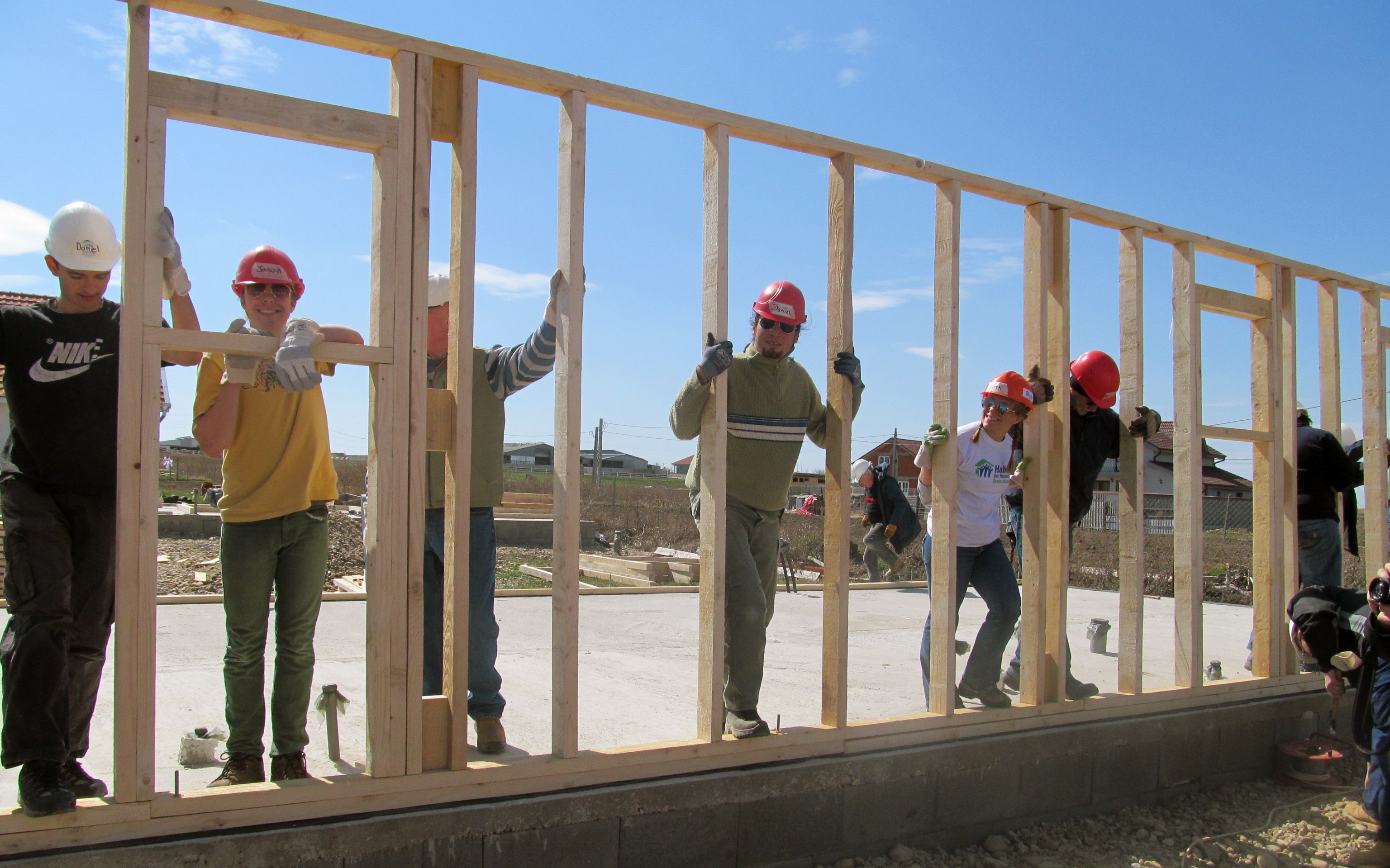 Robi, our Romanian supervisor, guides the ten of us who are spread out along the back wall of the house we’re building in the outskirts of Oradea this week. The house–a row house with three studio apartments–will be the new home to three young adults in their early 20s, who have grown up as orphans in Romania. We’ve come with fifteen students from the two high schools in Kandern, hoping to build relationships with our neighbors as we work together building this house.