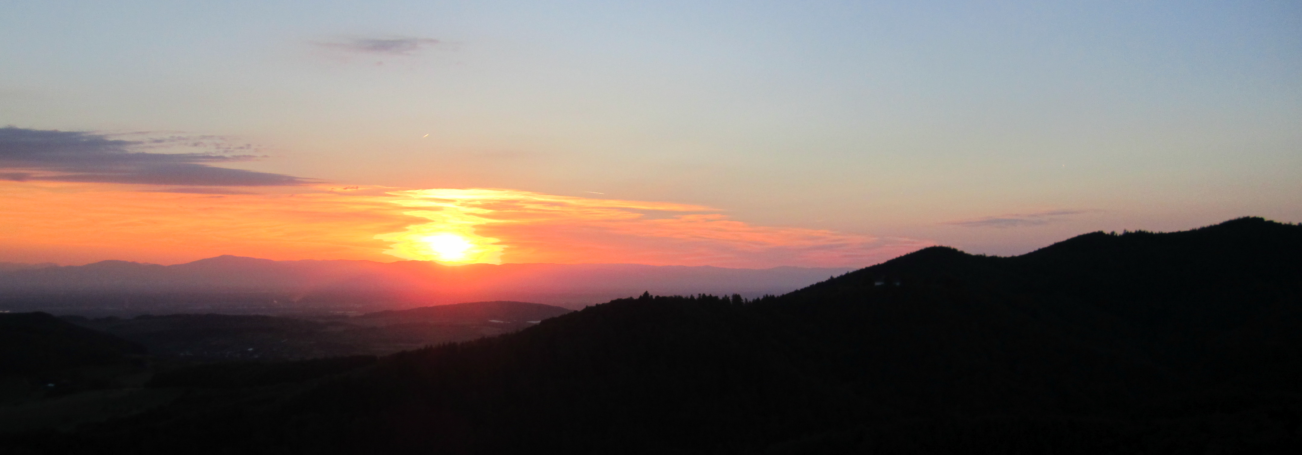 The sun is just beginning to set when we reach Ruine Sausenburg, a crumbly half of an 11th century castle holding state on a leafy ridge. Sausenburg is not a particularly well-maintained castle. There is one faded sign sketching out the history of the castle, below a much larger sign full of rules, which includes “No Campfires” despite the presence of fire pit, grill, benches and friendly supply of firewood in the courtyard. We leave our bags in the courtyard and drag ourselves up the dusty wooden staircase to the top of the tower.