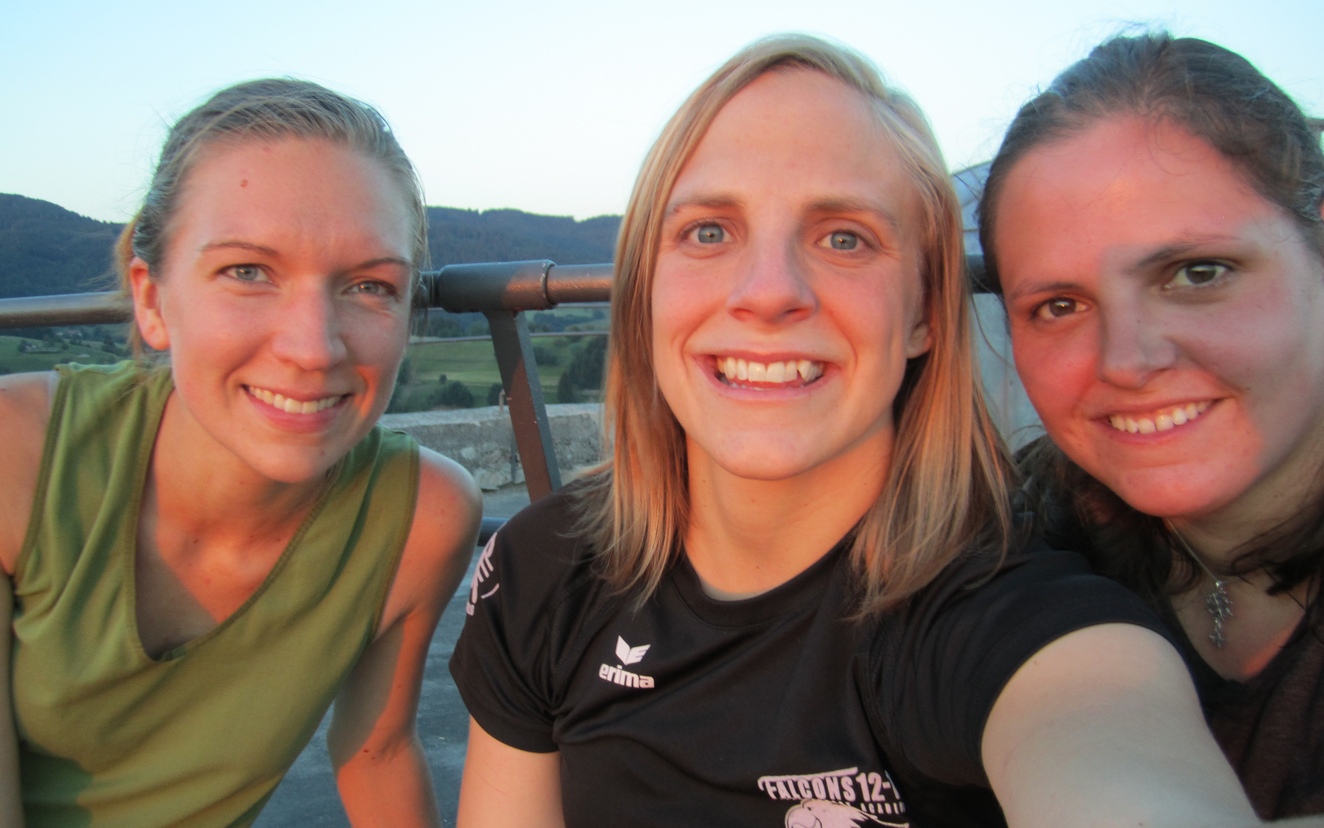 Even the tower isn’t terribly pristine or ancient-looking. The crenellated battlements are filled in with concrete, into which a circular iron railing sticks like a Sunday-school halo. We sit down on the wall, holding the railing with our legs dangling down, toes pointing to France. Awash in golden light, with Switzerland down to our left, the Black Forest behind and the Rhine Valley ahead, we toast to our years in this green valley, this place between.