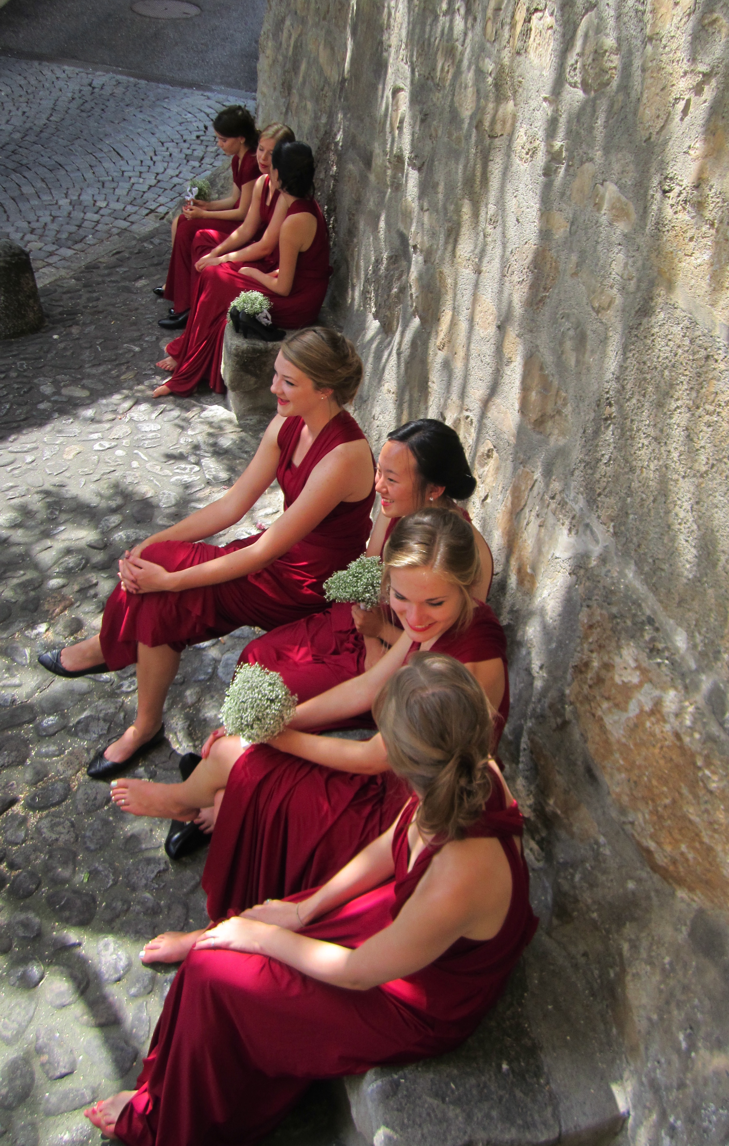 Many of Emily’s and my small group girls had been among the crimson-draped bridesmaids, and now they yawn their sleepy way to the breakfast table, laughing and collapsing into chairs. They tell stories from last night, last week, the years that they’ve known the young bride. They laugh about the breakfast–essentially good bread with things to put on it–and declare how much they’ll miss meals like this when they leave Europe.