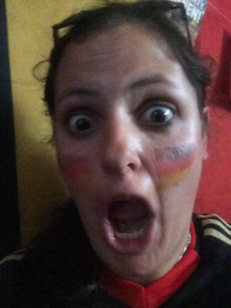Afraid of missing something, I pay fastidious attention to the rest of the game, a 7-1 rout by Germany, which will be catalogued in history with statistics particularly miraculous or damning, depending on your perspective. “What is even happening?” we cry, disbelieving, after each goal. “Does this ever happen?” We cheer as well as we can–and have dressed in the required red, black and gold–but we’re no match for the Kanderners, who shout, cry, and break into song as the victory grows more secure.