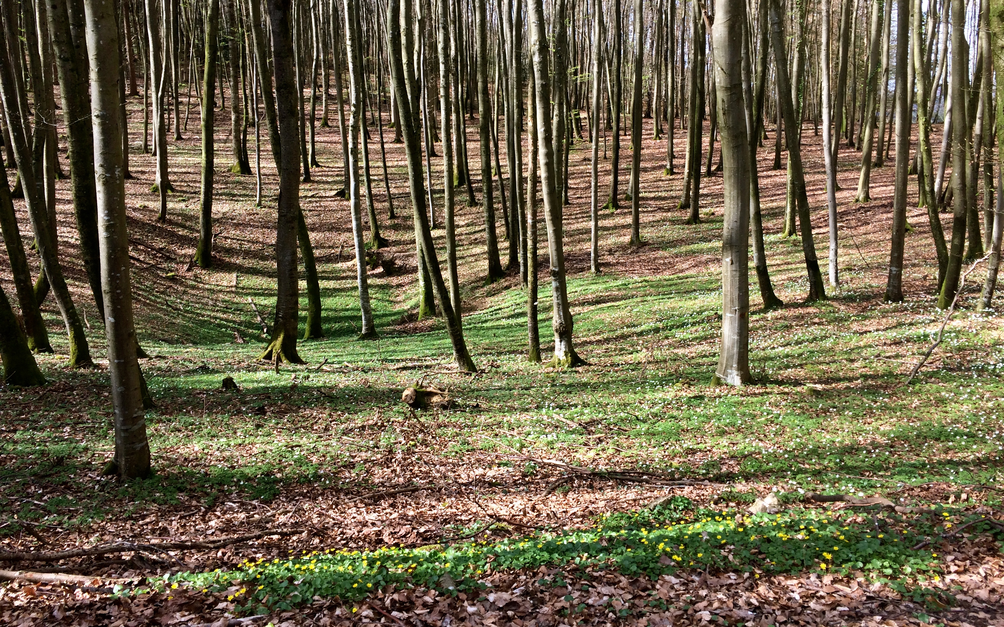 One day I walked high above our town, to where a particular stand of trees fills a dent in the hilltop and the undergrowth is especially thin. On snowy days it is elegantly striped with white floor and black trunks. In autumn it is a blaze of yellow, top to bottom.