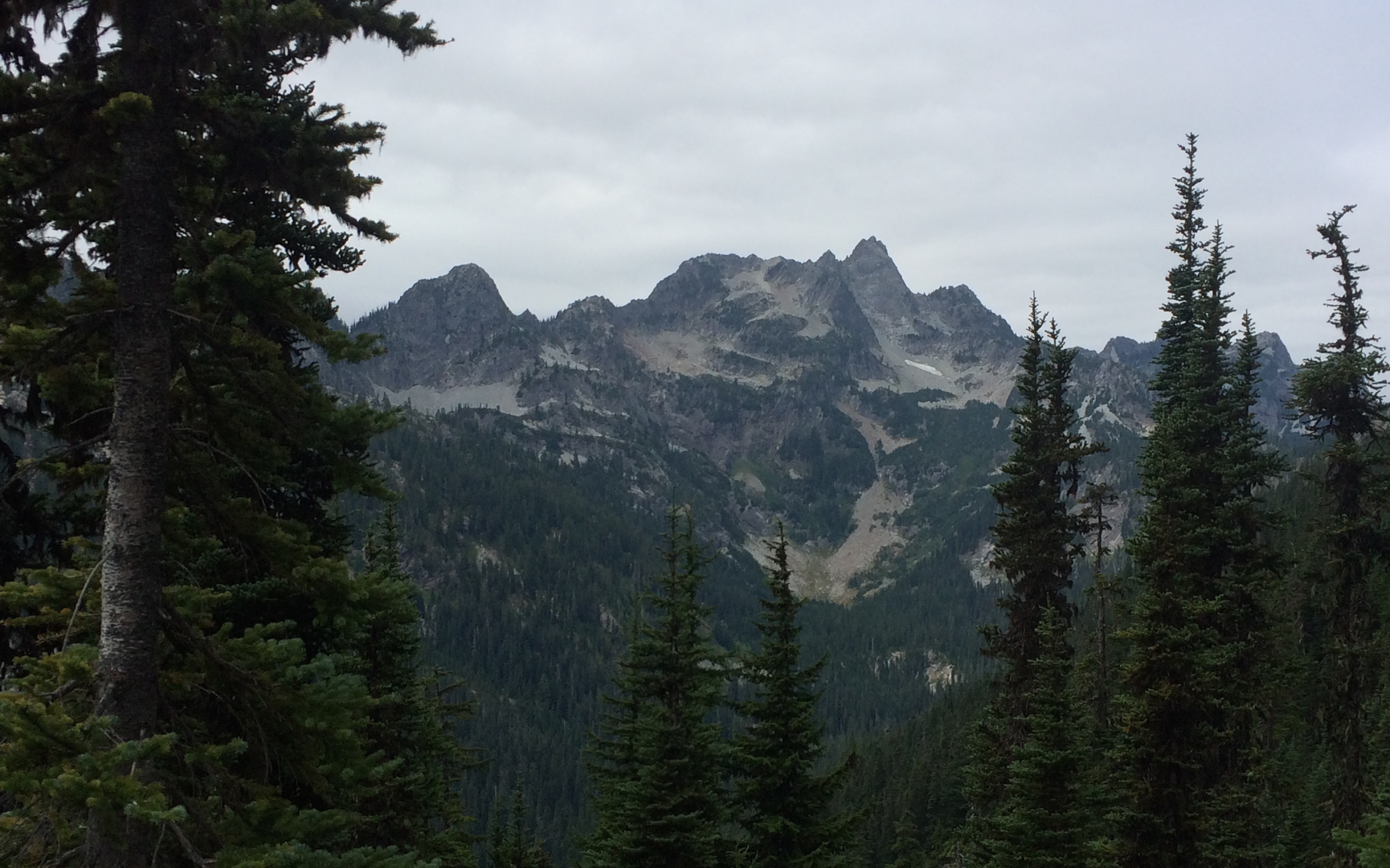 After a supper of delicious hamburgers with my parents, I leave the chalet half an hour before sunset, turning right to walk up our short road towards its origin at the nearby Interstate. I walk towards a glowing mountain, Guye Peak, its rocks and trees shining in the day’s last light.