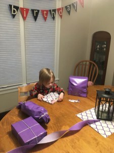 Except Luci loves purple, and I don’t love party planning. And, as I decorate the dining room and wrap the presents, I know that this is going to work really well for both of us. My daughter has a purple-themed party, and I bet she’ll like it.