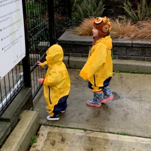 Not that I expect much complaint from them. They don’t care if they’re damp, and never seem to get cold. Being dirty is not a problem for them, and they seem to appreciate a good amount of space to run and be loud. A few weeks ago I ordered them matching yellow rain suits, which we call the Banana Suits, and they like nothing better than running around a wet playground in the rain.
