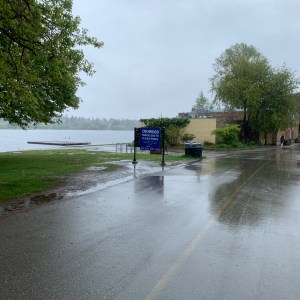 A typical Seattle spring day, pouring rain at an abandoned lake, decorated with some threatening signs. (“Crowded parks lead to closed parks!”)