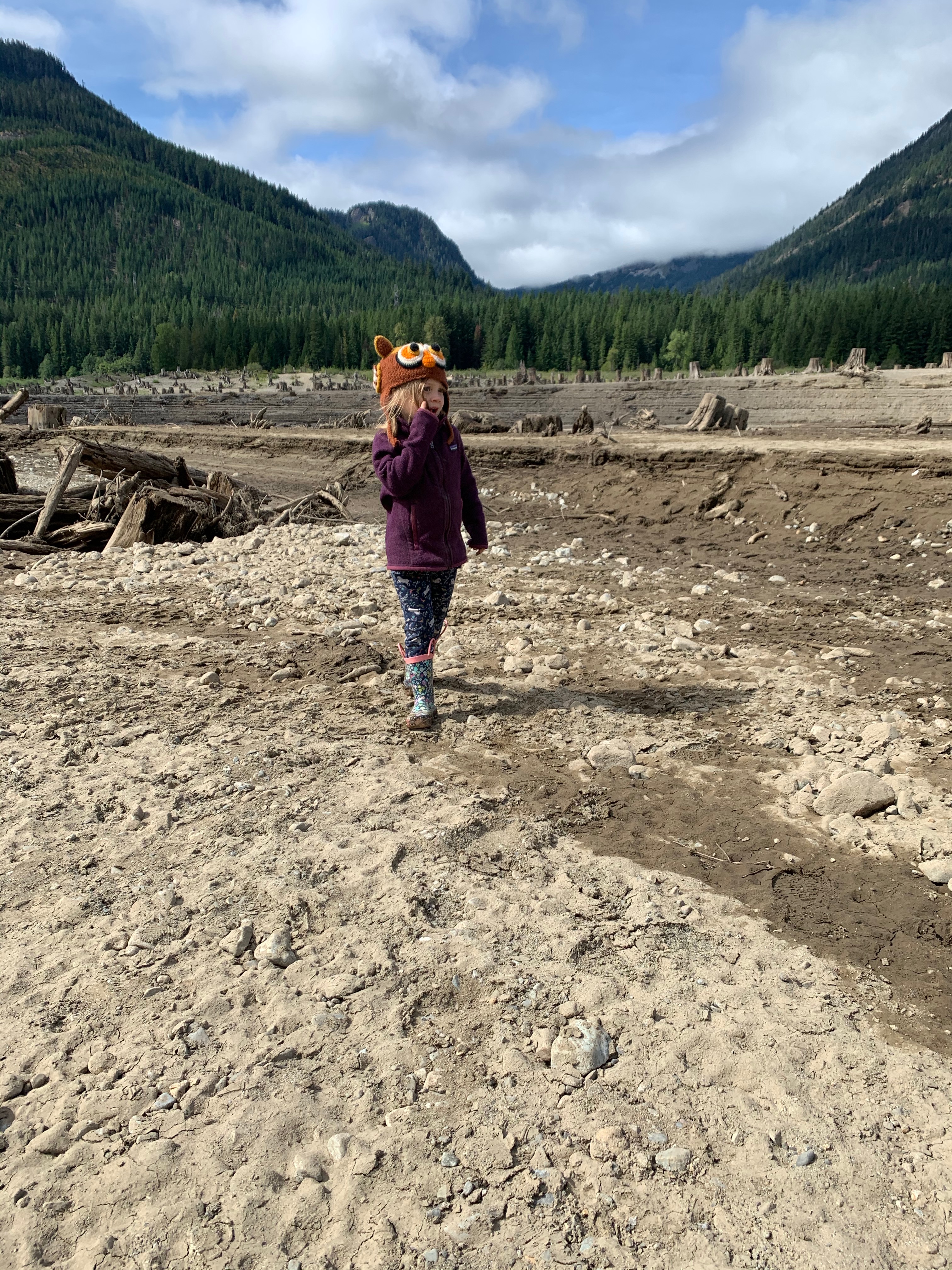 This one, though, is something else entirely. Taken at high noon in late summer, our family poses on the shore of Lake Ketcheelus. Our clothing is not only not coordinated, it’s not even clean. Nor are we. We had woken up that morning after our first night sleeping (but mostly not sleeping) in our new tent, and had come out to the lake with my brother and sister and their families. My hair is in two braids, tied up in a Rosie the Riveter scarf, and everyone else is wearing hats. Both of the girls are muddy from playing in the lake; Ellie has dirt on her forehead. Even the lake is at its least photogenic, in late summer mostly a dry, stumpy wasteland that stretches beyond us like the surface of a strange planet.