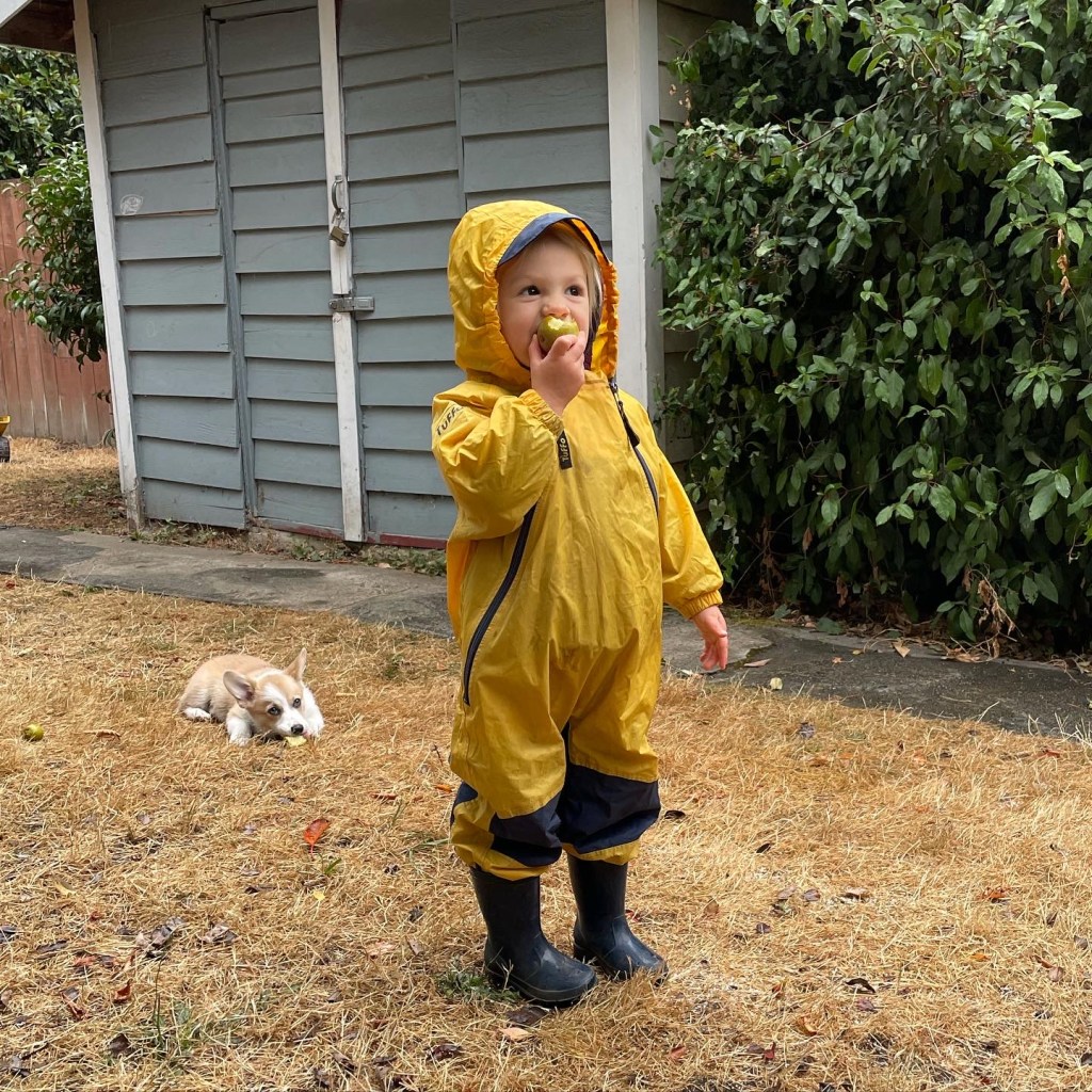 You learned to walk on the playground around the corner. You made your first friends there, before you could even talk. We spent our year outside here, 2020, months and months of dragging on the same yellow rainsuit that was at first swimming on you, and now barely reaches your wrists or covers your face. We planted and harvested three gardens, Dad’s plans growing more and more elaborate and beautiful. You sat beside your sister in the dining room as she started Zoom preschool, the same dining room where you celebrated your first, second, third and fourth birthdays. We brought a puppy home here, and then another. I pushed you down to the wading pool in a stroller. Then you walked. Then scooted. Now you can ride your balance bike down there, and if I could find a minute to teach you, I bet you could ride with the pedals on in no time. You have, in short, grown up here.