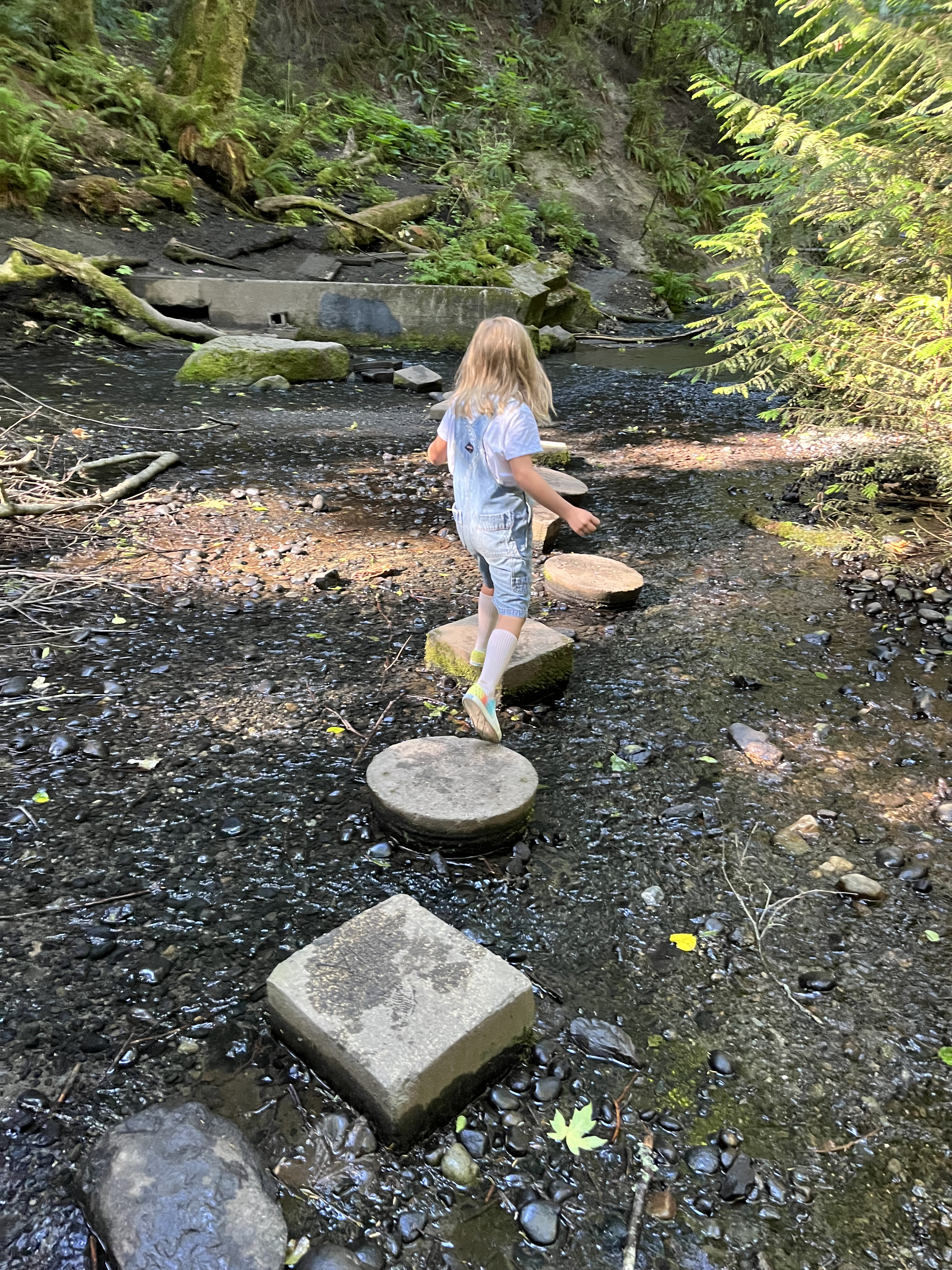 We’ve been here often this summer, but it still nearly takes my breath away to see my children skip confidently over cement stepping stones and hoist themselves up on a blue nylon rope swing, dangling out over the water. I’m not afraid, or in a hurry, or telling them to be careful. The feeling is more like awe, that they’re suddenly this big, rope swing big and creek crossing big. Awe that we’ve found a place, mostly by accident, where we can travel back and back to before Instagram and Pedalheads and Little Kickers, back to blackberries and a creek, to friendship on a hot summer day. It’s not Narnia, exactly, but it’s magic enough for us.
