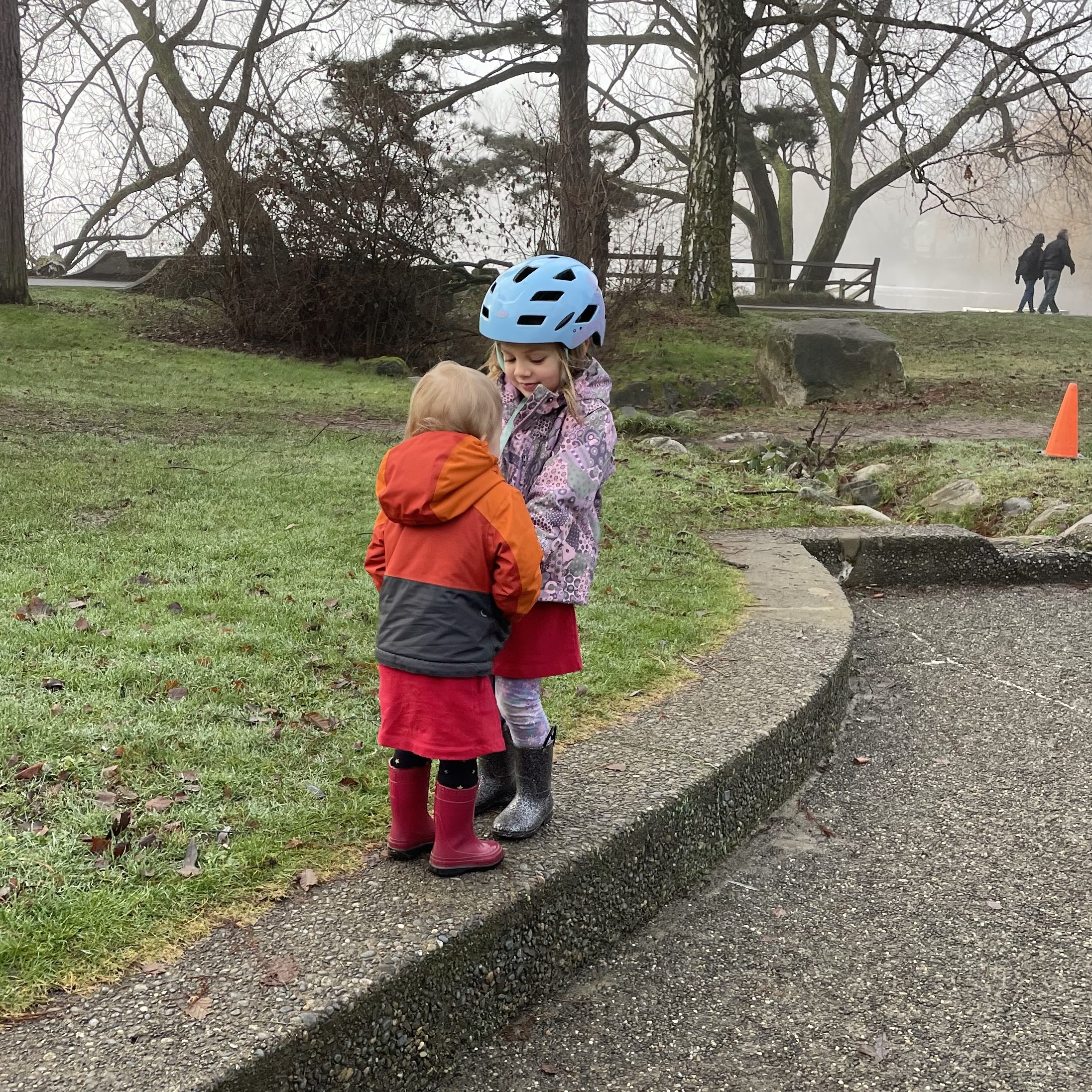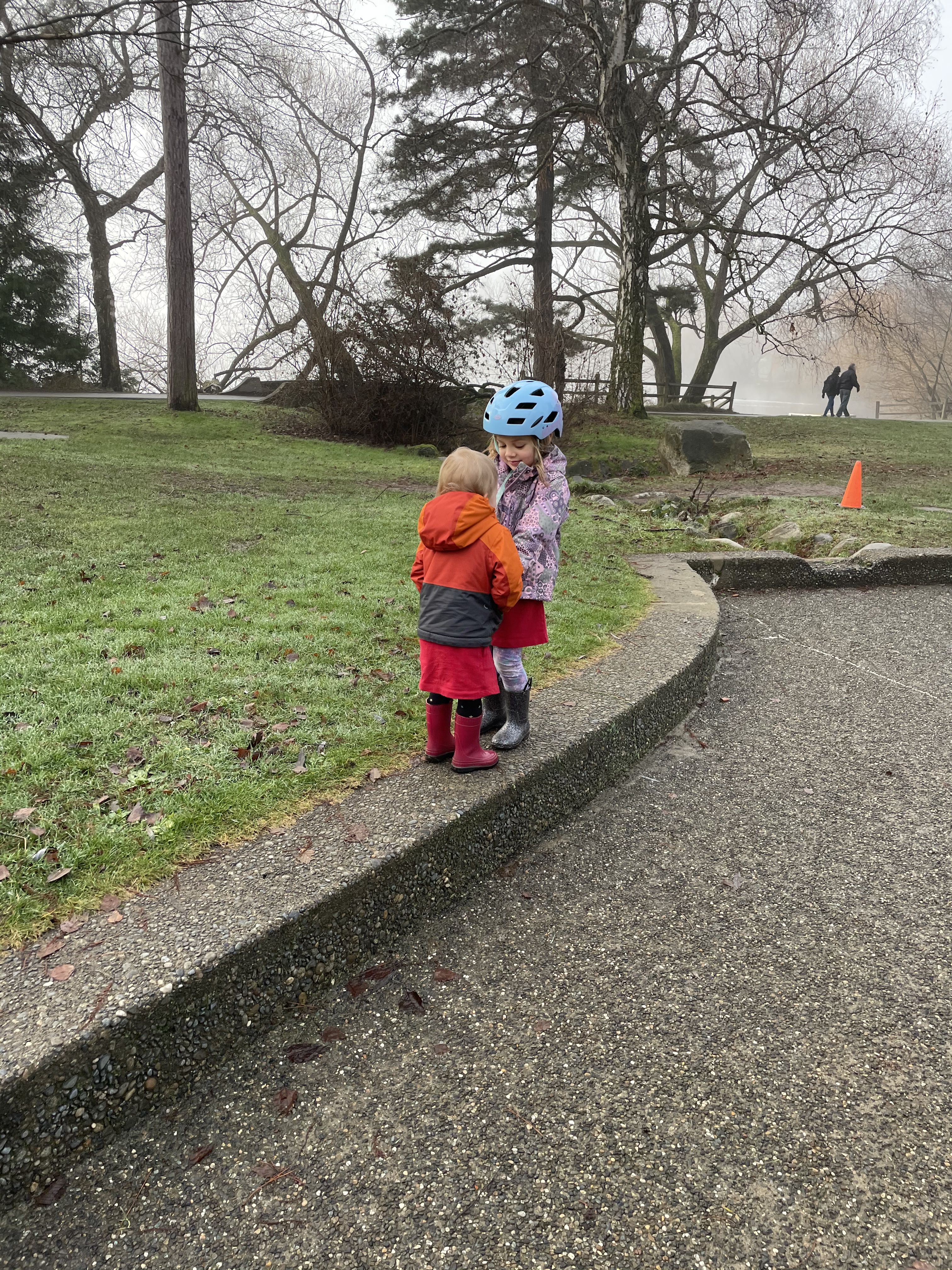 At 3:00 PM, the day looks inauspicious, and the plan that I crafted myself before dawn—a plan predicated on a dry Sunday afternoon—seems less pleasant than I’d hoped it would be. I had imagined sitting on a bench while kids skated and scooted around me. I’d imagined tea and apple slices and golden hour at Green Lake. Instead, I peer out into maybe-rain and definitely fog, and dusk an hour early. I rather wish I’d been a joiner in this scheme, a casual bystander who could peel off easily, rather than its actual originator. Still, a text pops into view telling me that the others are on their way, and so we should be too. Some ten minutes of arduous parenting and carrying and coat-donning later, during which I’ve loaded two girls, two scooters, and three pairs of roller skates onto our giant bike, and we’re off, sliding through the murky twilight towards the wading pool. As one does, late on January afternoons.